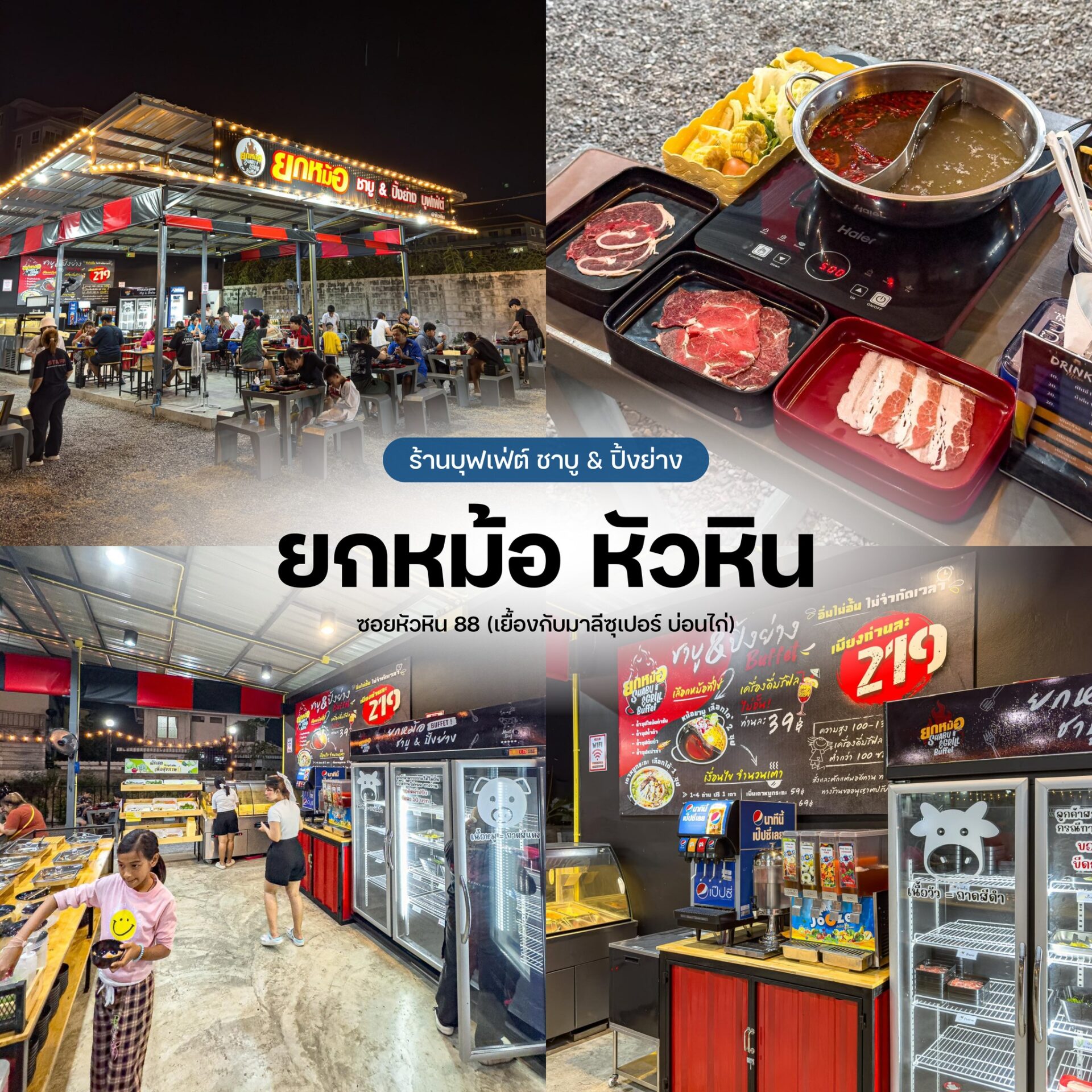 สายบุฟเฟ่ต์ไม่ควรพลาดร้านนี้ “ยกหม้อ หัวหิน” เป็นอีกหนึ่งร้านที่มีทั้งชาบู และปิ้งย่าง แบบไม่อั้น ไม่จำกัดเวลา สามทรถเลือกได้ตามใจชอบ ไม่ว่าจะสายชาบู ทางร้านมีน้ำซุปให้เลือกหลายแบบเลย หรือจะสายปิ้งย่างหมูกระทะ มีให้เลือกทั้งหมู เนื้อวัว ทะเล ของทานเล่น ไอศกรีม และของหวาน ส่วนตัวร้านก็บรรยากาศดี เหมาะดับการแวะมานั่งชิลล์ๆ ทานมื้อค่ำหลังเลิกงานสุดๆ บอกเลยว่าห้ามพลาดเด็ดขาด แล้วอย่าลืมแวะมาลองกันนะคะ ![]()