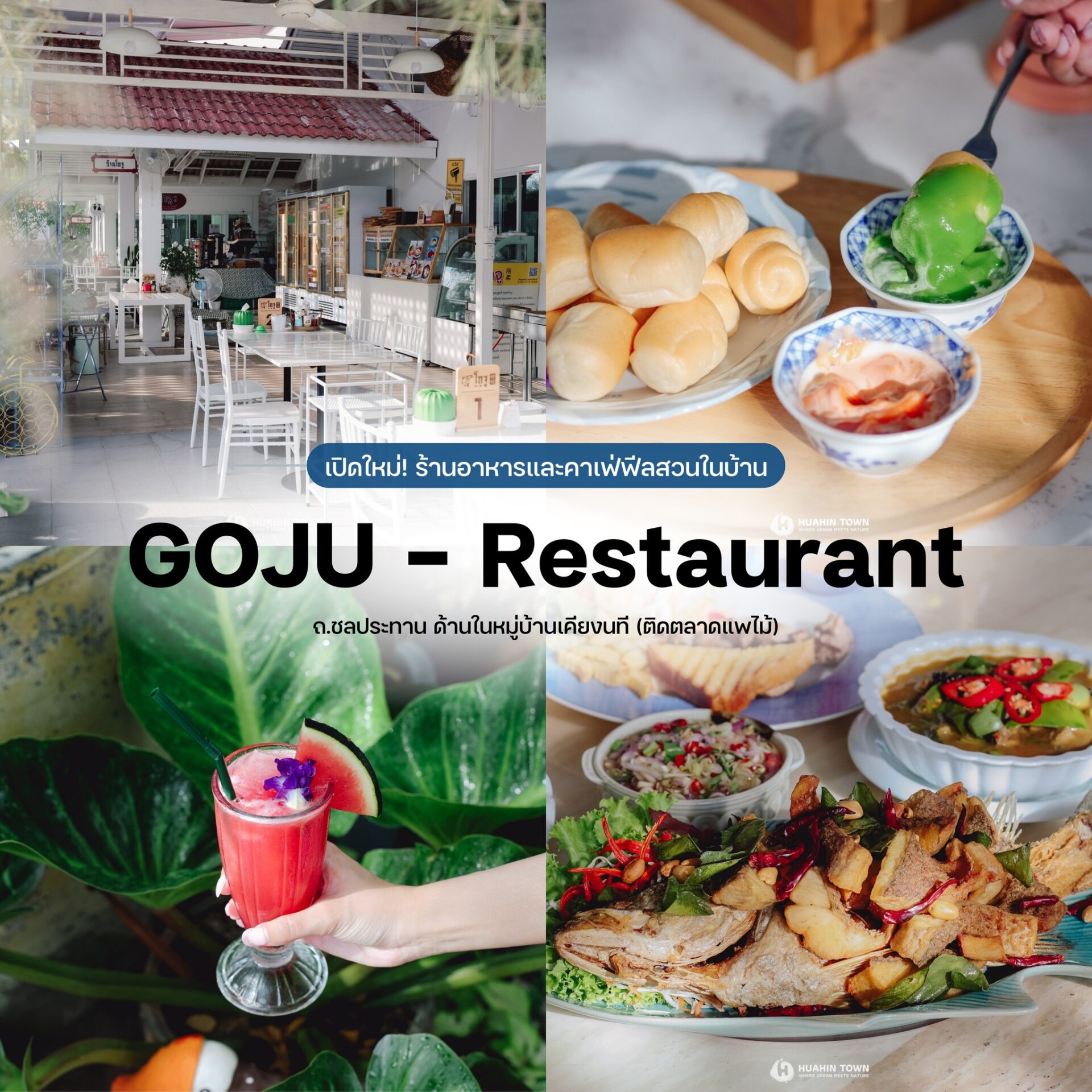 🌿 ร้านอาหารและคาเฟ่ฟีลสวนในบ้าน “GOJU – Restaurant” ตัวร้านตั้งอยู่ในหมู่บ้านเคียงนที ติดกับตลาดนัดแพไม้หัวหินค่ะ ถึงจะเป็นร้านในบ้านแต่ภายในกว้างขวาง มีโต๊ะให้เลือกนั่งทั้งโซนในห้องแอร์ และ Outdoor บริเวณโดยรอบตกแต่งด้วยของสะสมต่างๆ ให้ร่มเงาด้วยต้นไม้และดอกไม้นานาชนิด สงบ ร่มรื่น ให้ความรู้สึกเหมือนนั่งทานข้าวในสวนหลังบ้านเลย ที่นี่มีเมนูให้เลือกหลากหลายมากๆค่ะ ไม่ว่าจะเป็นเมนูกับข้าว ไฮไลต์เด็ดต้องยกให้ กุ้งแม่น้ำคั่วพริกเกลือ/แกงป่าไก่บ้านแสนตุ้ง/หลนปู/ปลากระพงลุยสวน หรือจะเป็นอาหารจานเดียว สเต็ก/สลัด/อาหารเช้า และติ่มซำนิ่งสด ที่มีให้เลือกอย่างละลานตา ตบท้ายด้วยของหวานอย่าง ขนมปังโฮมเมด ดิปซอสสังขยา/ใบเตย และเครื่องดื่มเพิ่มความสดชื่น ทั้งชา กาแฟ อิตตาเลี่ยนโซดา น้ำผลไม้ เป็นอีกหนึ่งร้านที่มีเมนูครบทั้งคาวและหวาน อีกทั้งยังบรรยากาศสบายๆ จะสายกินจริงจังหรือนั่งคาเฟ่ชิลล์ๆก็สามารถแวะไปได้ตลอดวัน 💚