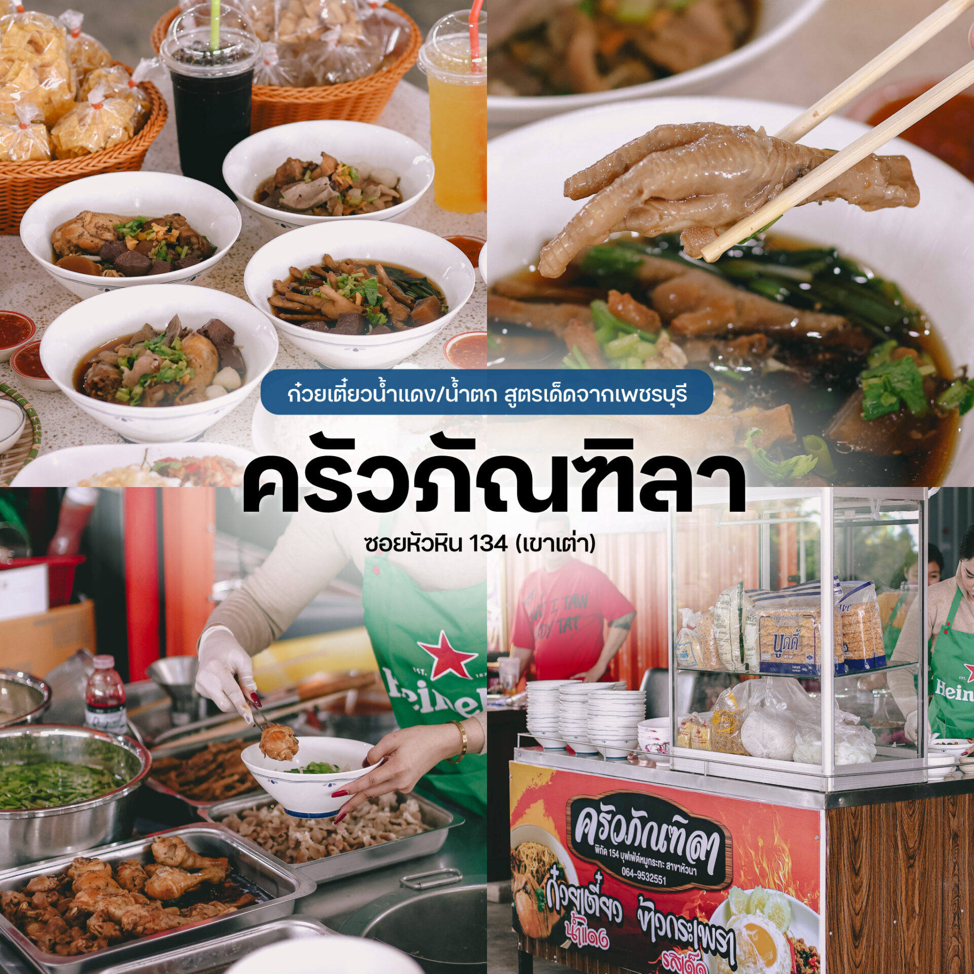 “ครัวภัณฑิลา” ร้านก๋วยเตี๋ยวน้ำแดงสูตรเด็ดจากเพชรบุรี ตั้งอยู่ย่านหัวนา ซอยหัวหิน 112 ร้านนี้กลางคืนจะเปิดเป็นบุฟเฟต์หมูกระทะค่ะ ส่วนกลางวันจะขายก๋วยเตี๋ยวและข้าวกะเพรา บรรยากาศภายในกว้างขวาง มีโต๊ะที่นั่งเยอะ รองรับหมู่คณะได้สบายๆ เมนูก๋วยเตี๋ยวของที่นี่จะเป็นก๋วยเตี๋ยวน้ำแดง มีทั้งหมูนุ่ม หมูตุ๋น ไก่ตุ๋น ตีนไก่ น้ำซุปปรุงรสชาติมาได้กลมกล่อม ติดหวานนิดๆตามสูตรเพชรบุรี เทซอสสูตรเด็ดของทางร้านลงไป โรยด้วยกากหมูเจียว เกี๊ยวกรอบๆ รสชาติกลางๆกำลังดี ไม่ต้องปรุงเพิ่มเลย นอกจากก๋วยเตี๋ยวแล้ว ก็ยังมีเมนูข้าวกะเพรา เครื่องดื่มสมุนไพร และปิดท้ายด้วยของหวานคู่บุญอย่างขนมถ้วย อิ่มอร่อยได้ในราคาเริ่มต้นที่ 40 บาทเท่านั้น