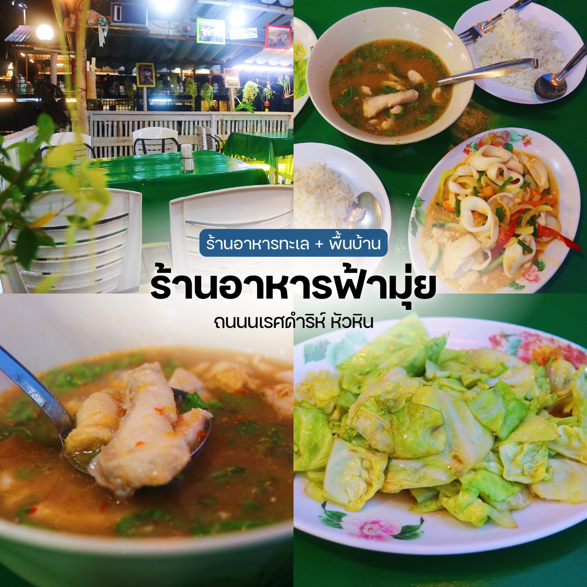 อีกหนึ่งร้านเด็ดที่มาหัวหินไม่ควรพลาด ร้านอาหารทะเล อาหารไทยพื้นบ้าน โดยจะมีเมนูที่คนหัวหินดั้งเดิมคุ้นเคยกัน รวมถึงเมนูแกงใต้ต่างๆ ที่เป็นสูตรเฉพาะของทางร้านอีกหลากหลายเมนูเลยค่ะ ไม่ว่าจะเป็น แกงส้มพริกนกปลากระพง หมูกุเลาคุณย่า กุ้งผัดสะตอกะปิ ปลาทอดราดขิงกรอบ และอื่นๆอีกเพียบ รสชาติถือว่าถึงเครื่องสุดๆ ใครมาหัวหินอยากลิ้มลองรสชาติของคนพื้นที่ ลองแวะมาที่นี่กันได้เลย รับลองว่าไม่ผิดหวังแน่นอนค่ะ ![]()