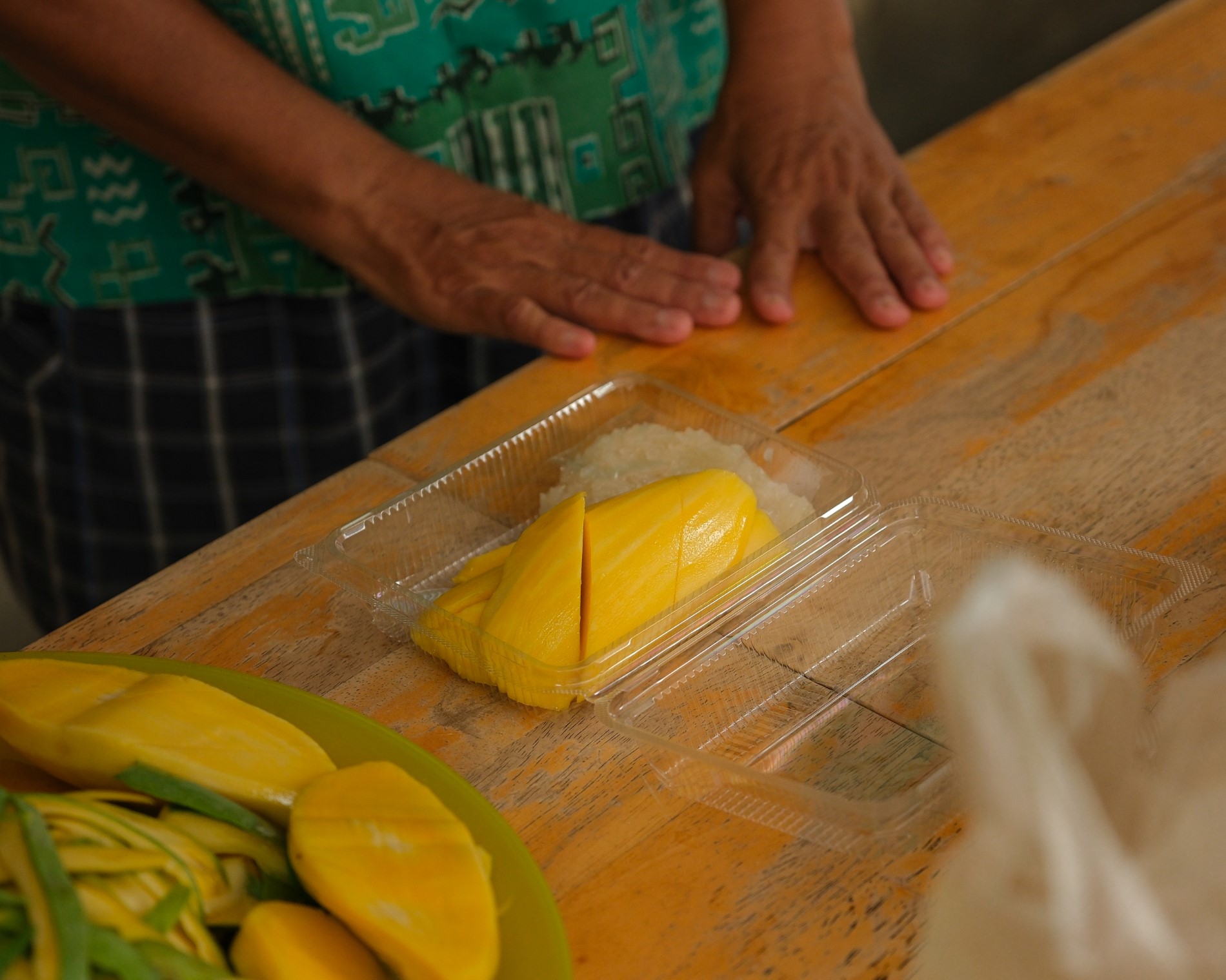 “เราจะเลือกมะม่วงตามฤดูกาล ถ้าไม่ใช่ช่วงที่รสชาติดีจริง ๆ เราจะไม่ทำค่ะ เพราะควบคุมคุณภาพไม่ได้” พี่ติ๋มย้ำชัด นอกจากมะม่วงแล้ว ข้าวเหนียวและกะทิก็เป็นสิ่งที่ทางร้านให้ความสำคัญที่สุด ทุกเช้าเลือกและกะปริมาณให้พอดีเพื่อไม่ให้เหลือทิ้ง